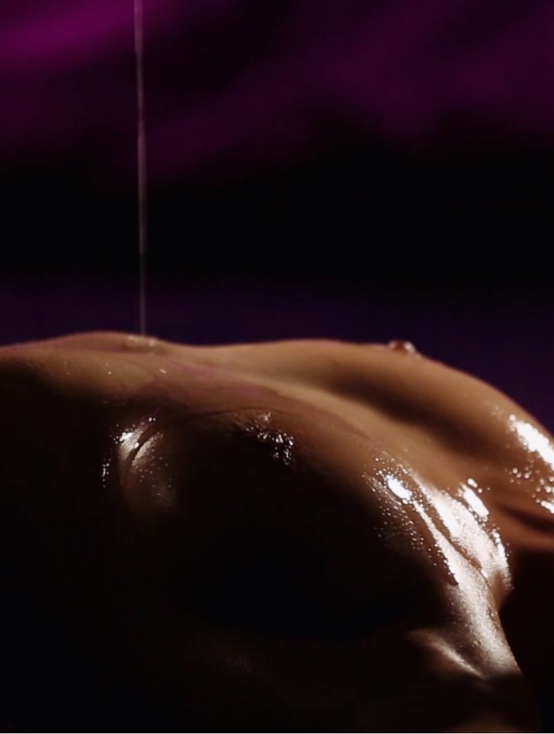 Next up, massage oil. The sensory deprivation of the blindfold combined with the sensory delight of an oil massage is a tantalizing combo. Imagine having no clue where the oil will be dripped on you next. (3:52)
